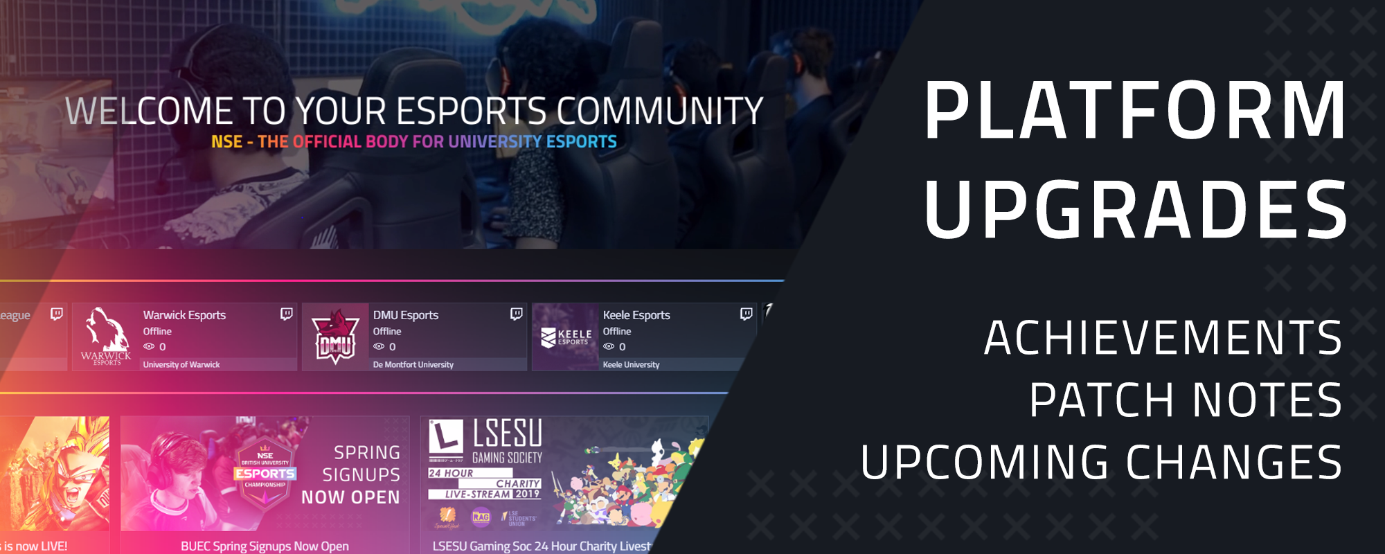 We want to add them for other university competitions too. So far we have added Arrow League and the Fragsoc CS:GO Masters. If you are running an inter-university competition and would like it to be remembered as an achievement get in touch via support@nse.gg.