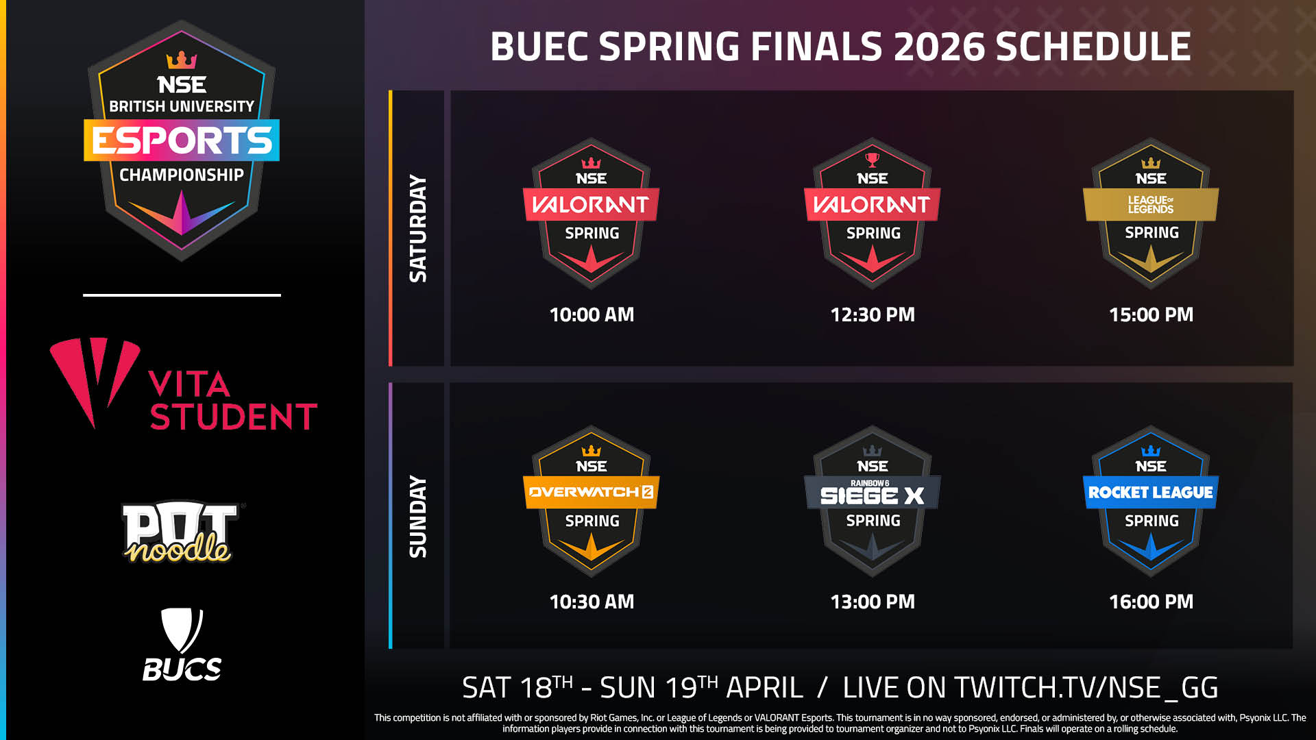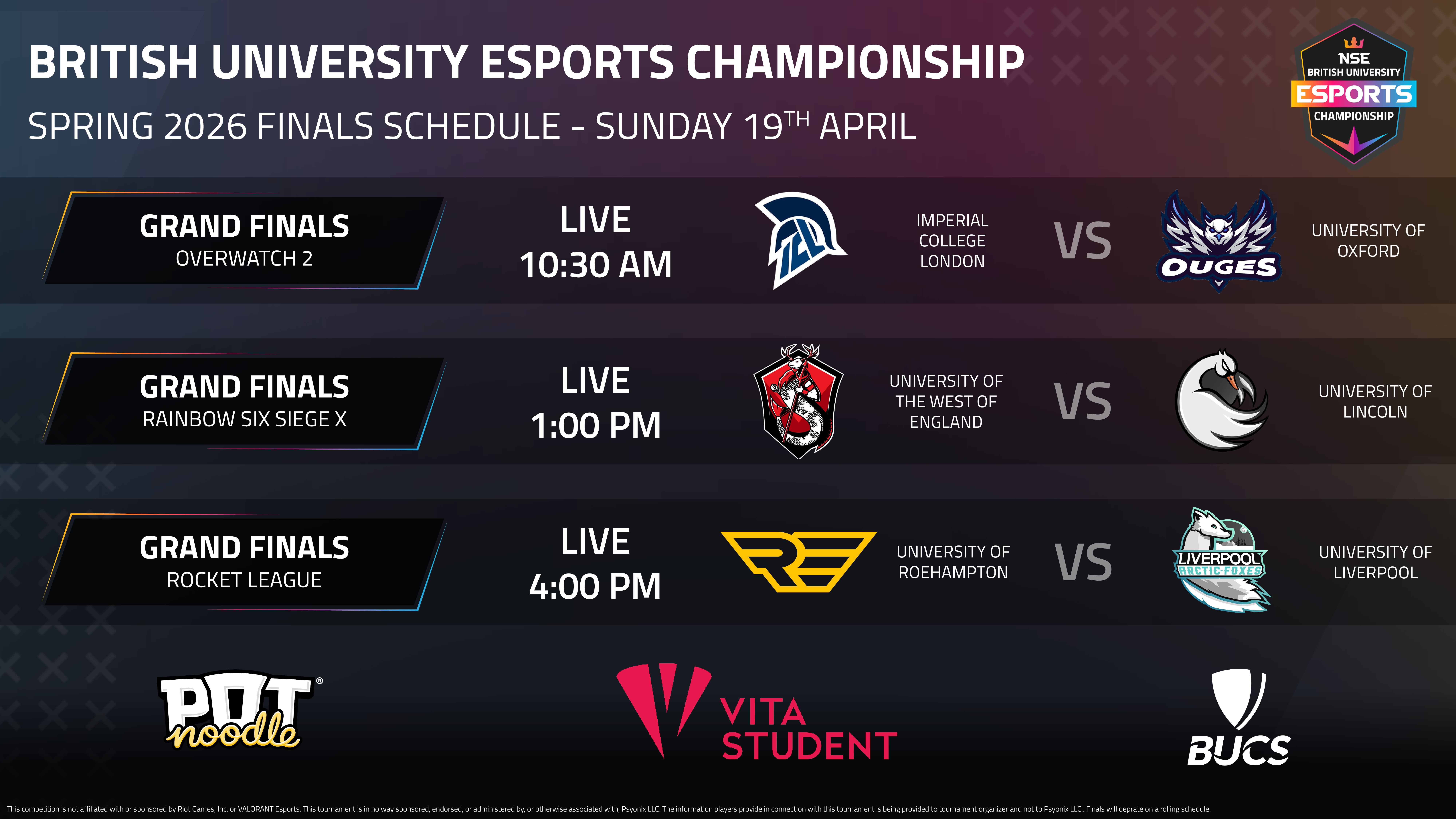 The second day of the BUEC Spring 2026 Finals kicks off today, following on from our action-packed matches in VALORANT and League of Legends. Massive congrats to all the winners! You can check out even more top-level gameplay for the rest of the weekend in Overwatch, Rainbow Six Siege X and Rocket League!