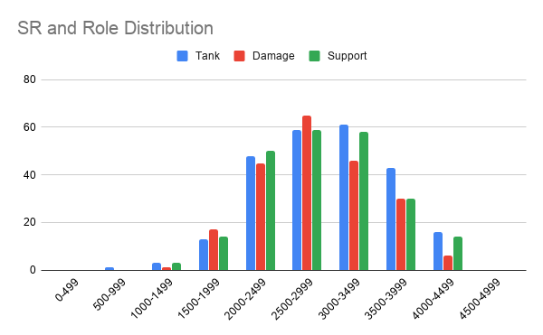 Which role are university students best at? Take this with a large pinch of salt because there are a significant number of other factors that have come with role Q that will feed into this but, damage players are almost universally worse than tank and support. The top 20% of damage SR is over 100 SR lower than the top 20% for tank and support, this trend continues all the way down to plat as the average SR for tank and support are 2932 and 2927 respectively, whereas damage is almost 100 lower at 2830.