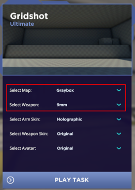 - Click the edit loadout button and select the settings - Map: Graybox and Weapon: 9mm