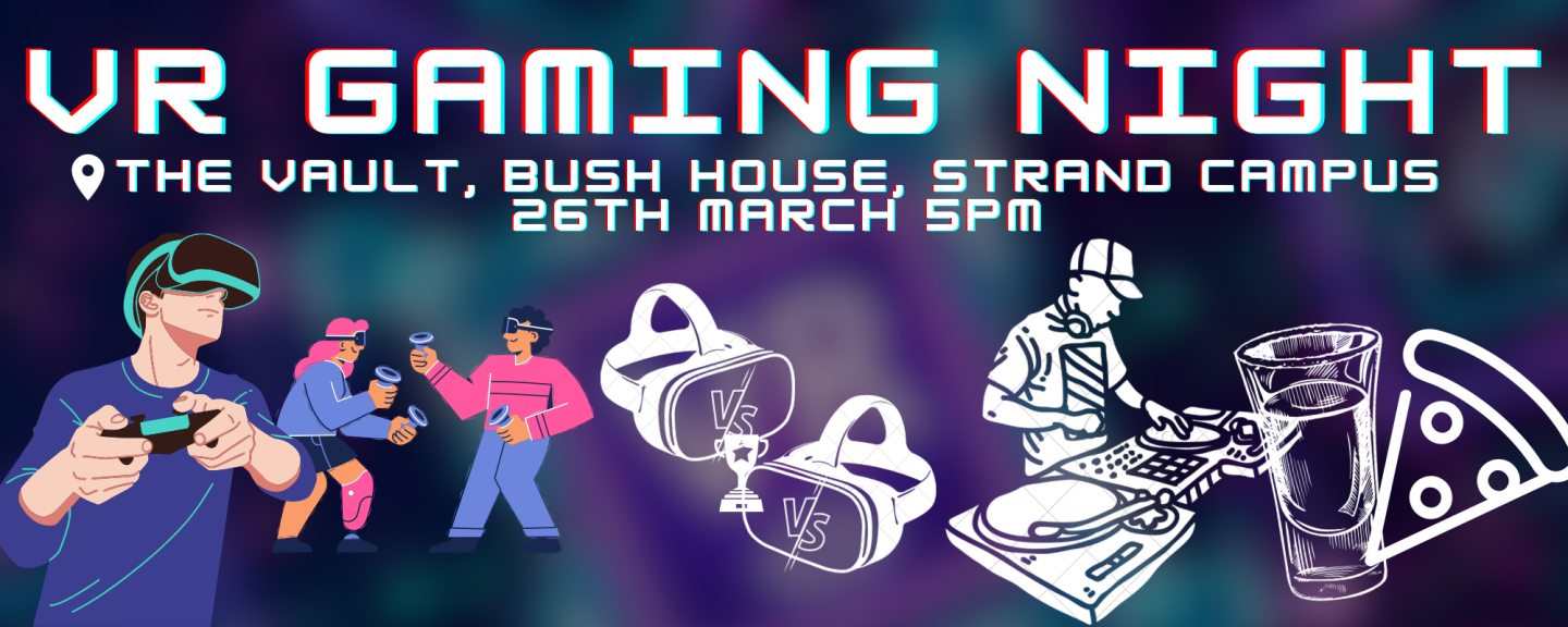 VR Gaming Night is in collaboration with student societies from KCL and LSE - supported by funding from the Dept of Culture, Media & Creative Industries at KCL.