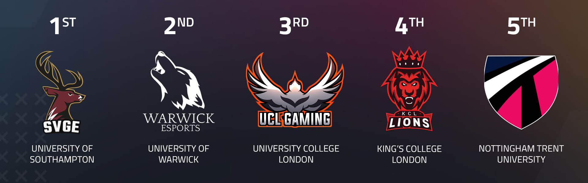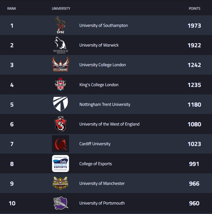 For the first time, the University of Southampton sit atop the Winter leaderboard, improving on their second place Winter position last year. We will have to wait and see if they are able to keep this amazing momentum going throughout the Spring BUEC season to secure the title of Esports University of the Year.