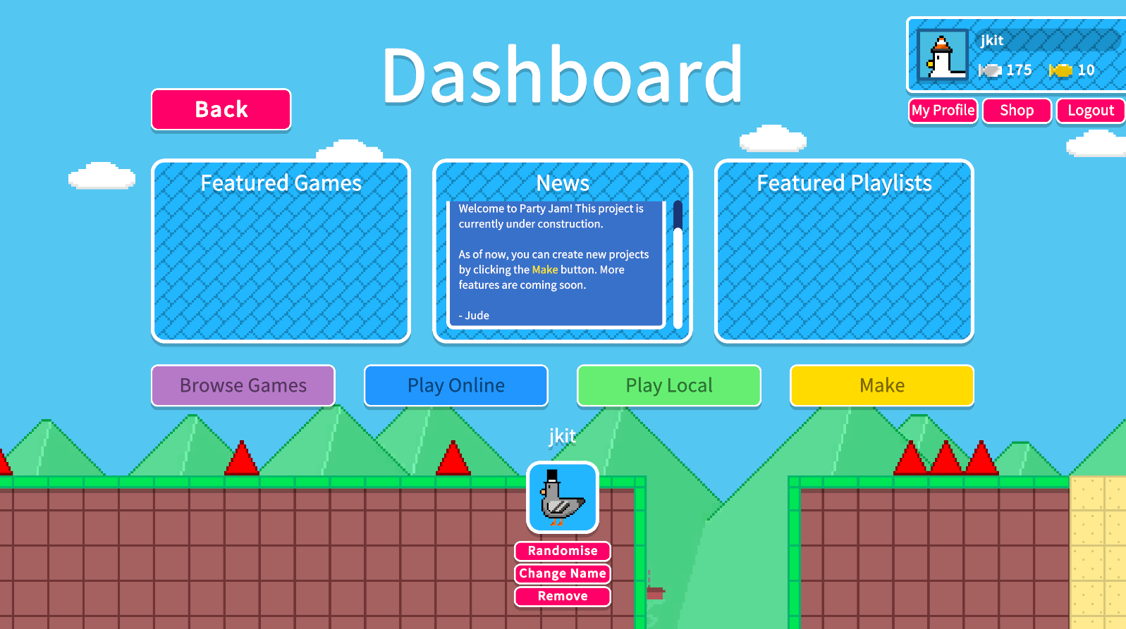 Party Jam is an in-browser game creation and sharing platform. Users can create multiplayer levels and games, without needing to program or even download an application. These can then be played as party games with other players in an online vs mode. The default game is a platformer similar to Mario Maker, however down the line ideally users will be able to make any kind of game.
