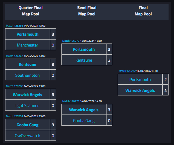 Congratulations to our winners Warwick Angels! If you would like to have a look at the overall bracket see below: