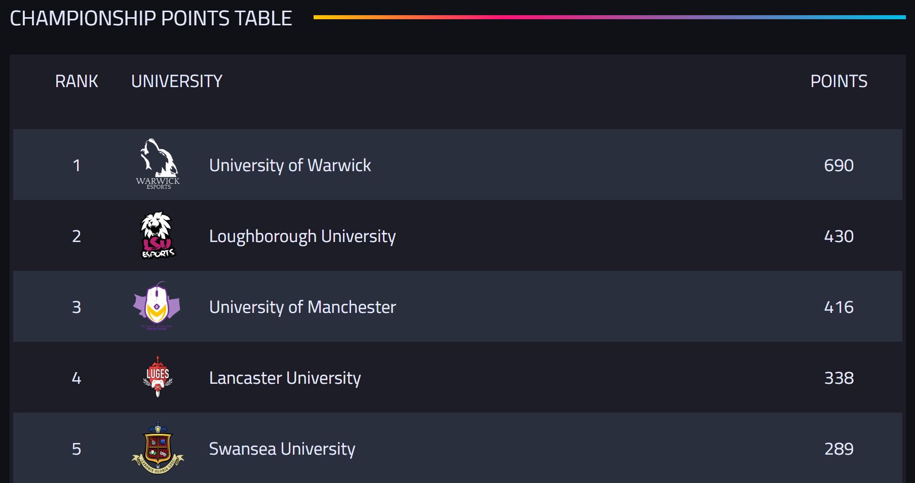 For those not in the loop, the inaugural ‘Esports University of the Year’ title will be awarded to the university with the most points in the British University Esports Championship (BUEC) table. Teams competing in any of the seven Championship games are eligible to earn points for their university. The current BUEC standings are as follows: