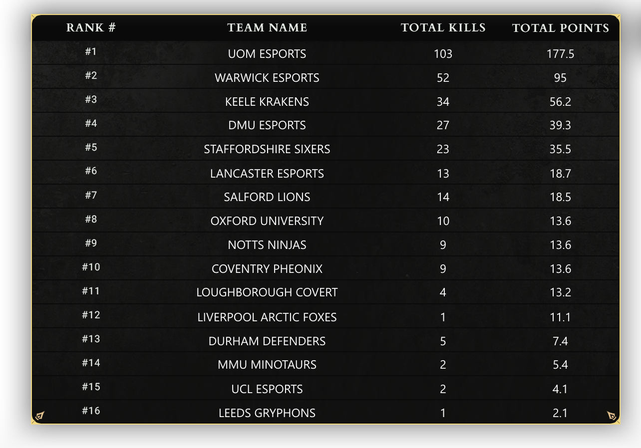 As you can see from the points table below, the team from the University of Machester have dominated their way into first place! They finished first in three of the four games and had a whopping total kill count of 103. The University of Manchester team better look out, they will surely have a target on their backs next week!