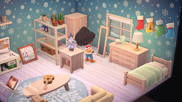 Finally, we see a line of Christmas stockings above the player’s bed – another new item that might be available to buy from Nooks. We see a mini festive tree behind the player and a snowflake wallpaper for the room. These are both DIYs available during the festive season and can be found randomly in balloons.