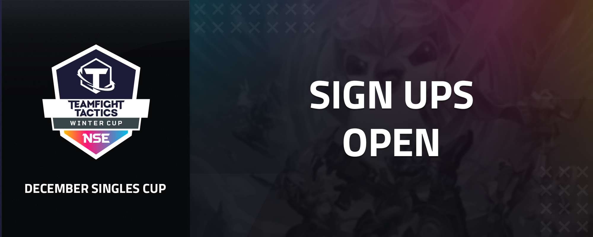 Teamfight Tactics NSE December Cup is the second of three TFT cups being ran this term. It will run using a double elimination format with players being eliminated if they finish in the bottom 4 of their group twice.